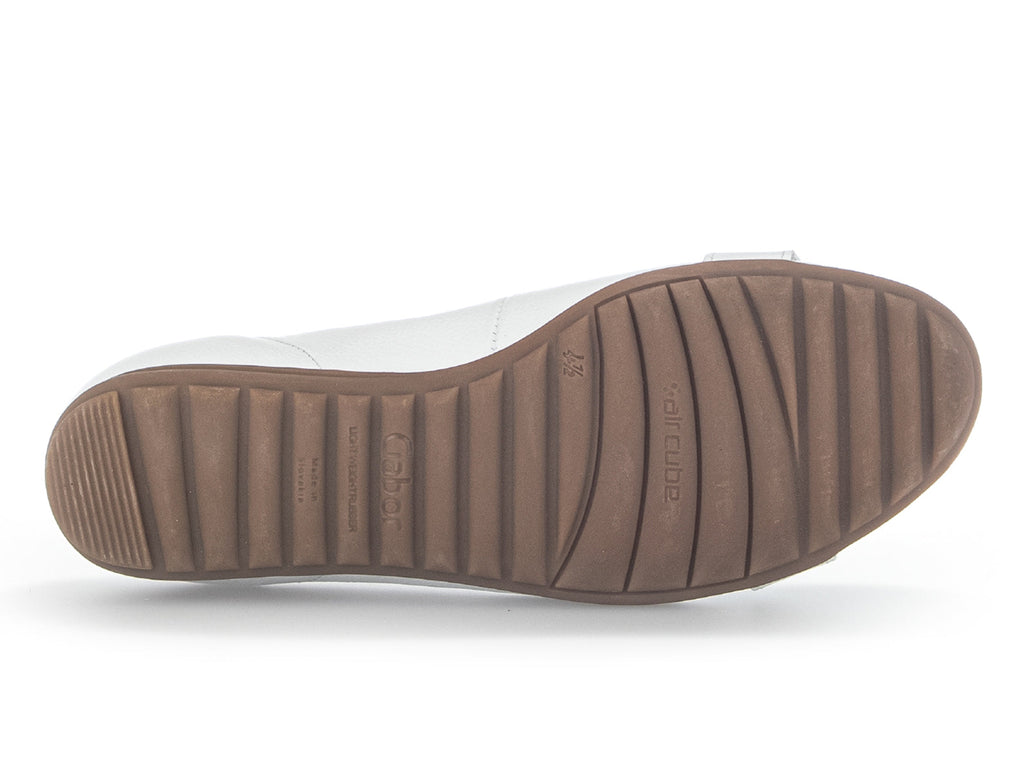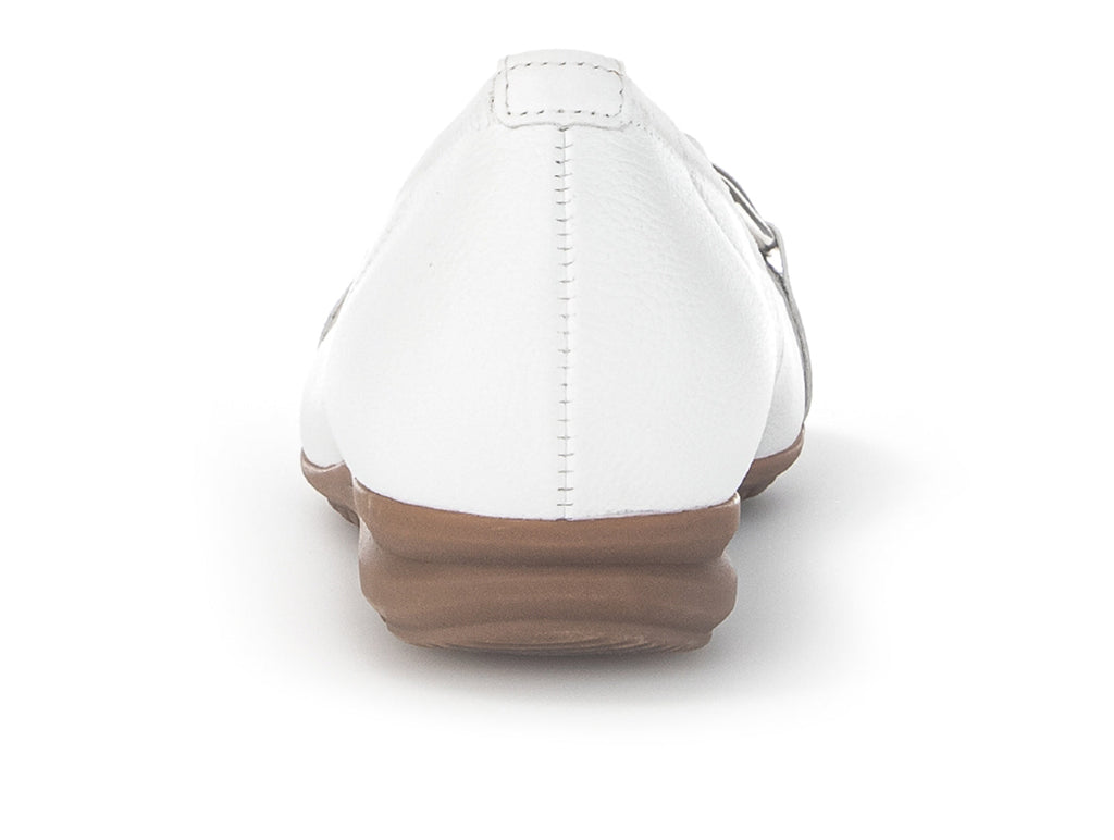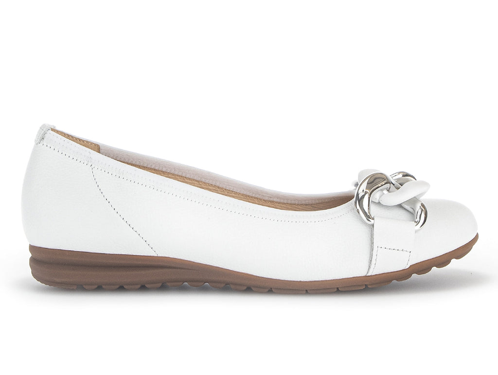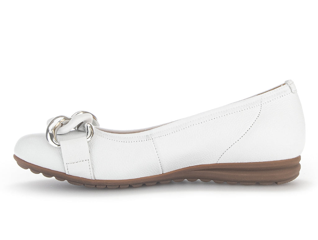 The beautiful Gabor 22.625.50 ballerina style pump in white is comfortable and practical. The upper consists of soft white leather. An oversized link across the instep incorporates a white link interlacing with silver links. As a slip-on style these shoes allow for an easy on off. A padded footbed gives day long comfort. The grooved sole offers stability and flexibility. The subtle wedge heel adds 2cm of wearable height. At Gabor Shoes Ireland we think these shoes would be perfect for everyday wear.
