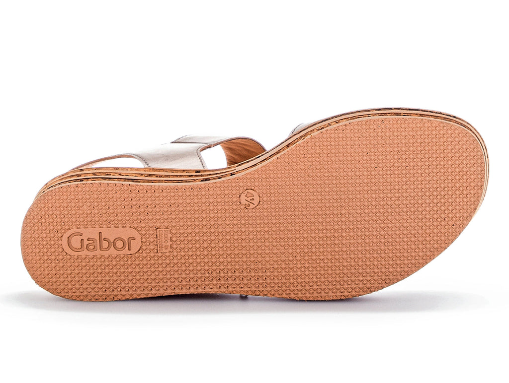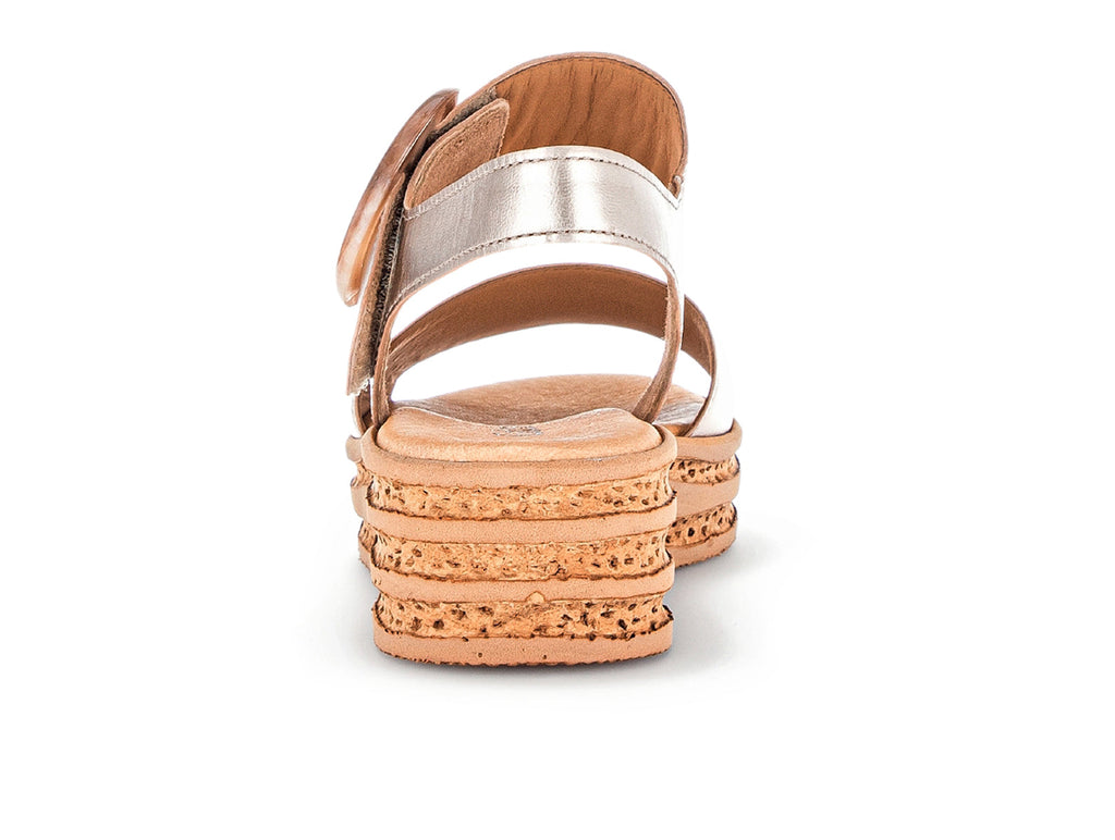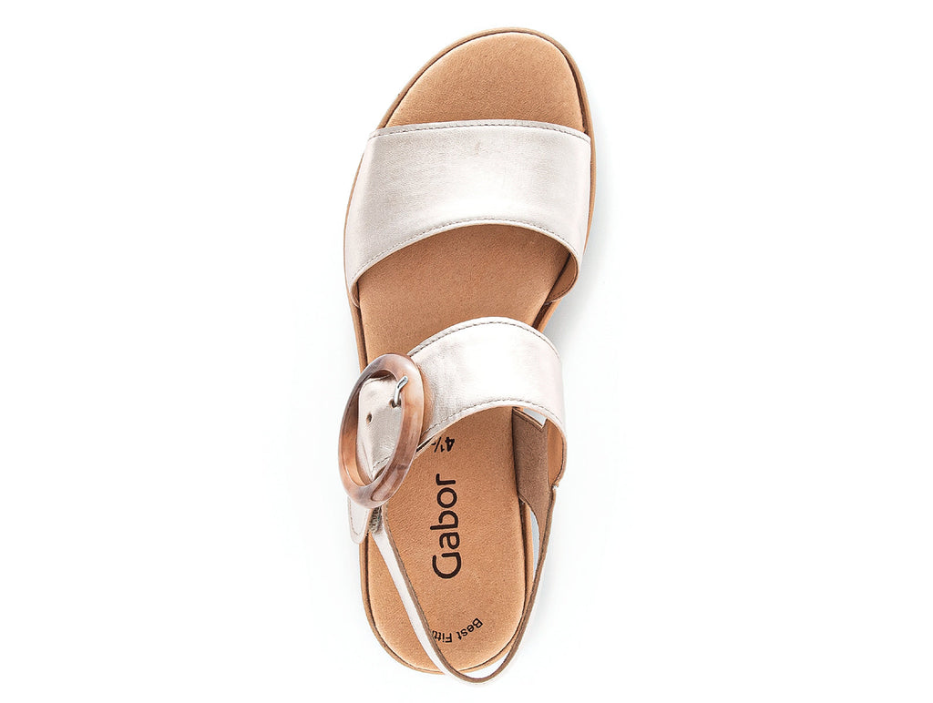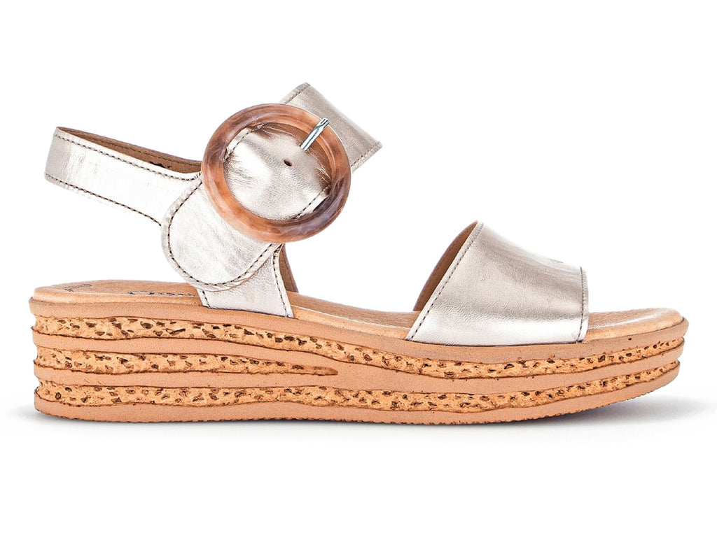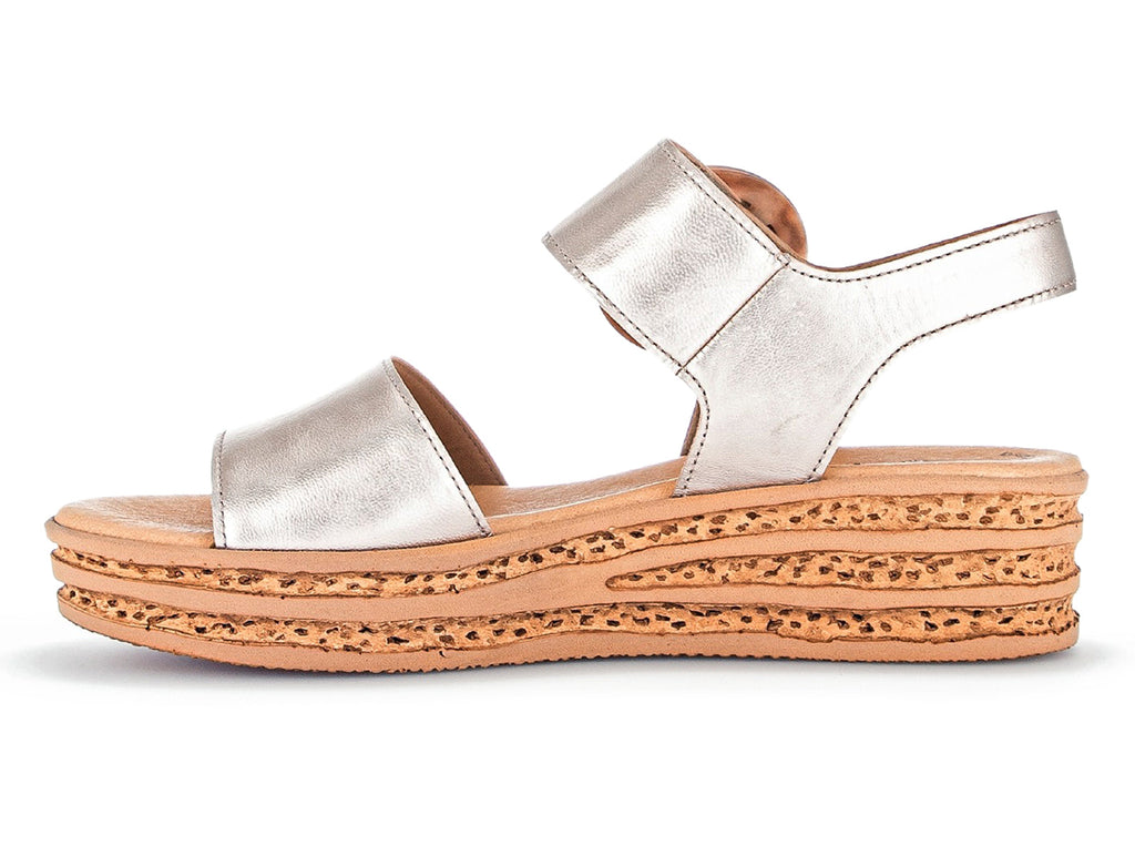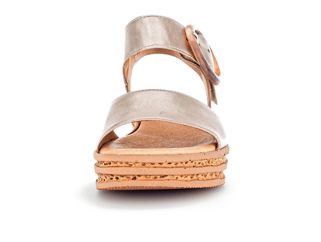 Gabor 24.550.62 in Puder is a beautiful subtle gold metallic sandal on a platform sole. The Velcro close disguised by a faux buckle allows for an easy on off. Part of Gabor’s BEST FIT range this sandal has a wider thread surface at the ball of the foot giving an extremely comfortable wearing experience. The heel adds 4.5 cm of wearable height. Here at Gabor Shoes Ireland, we think the Gabor 24.550.62 in Puder would look great with a maxi or midi dress.