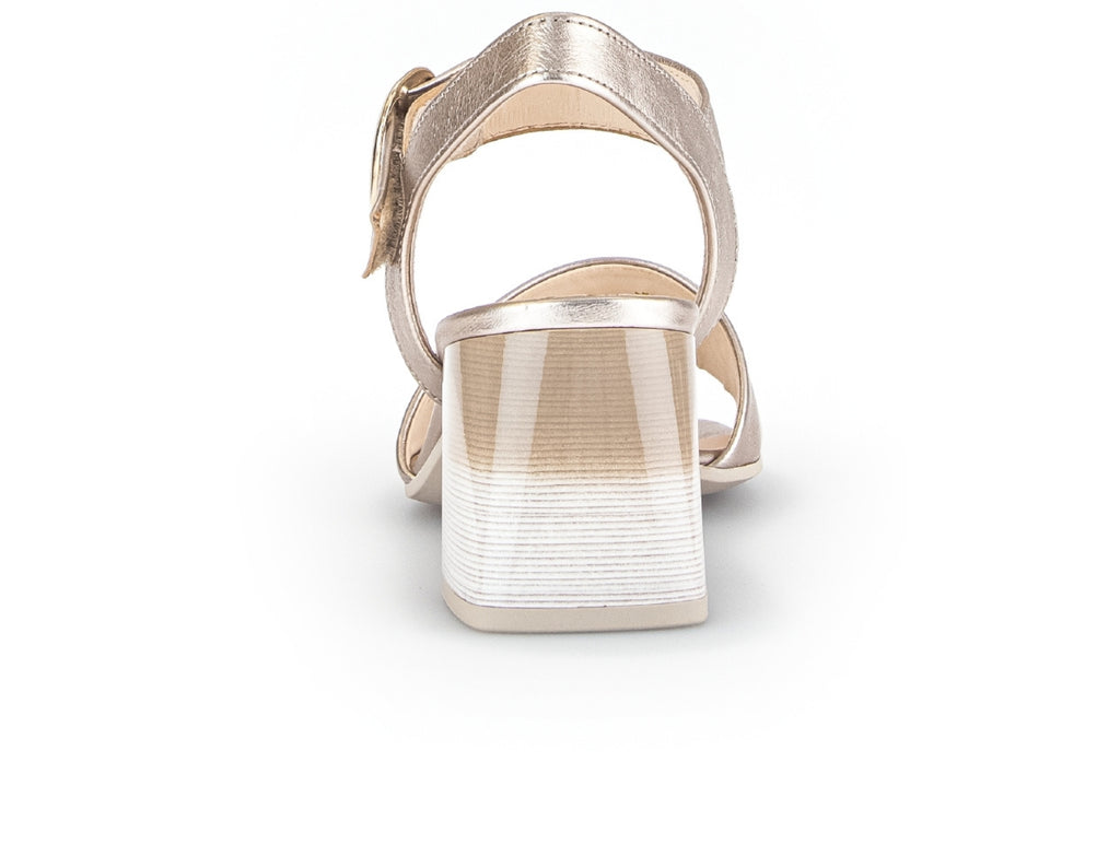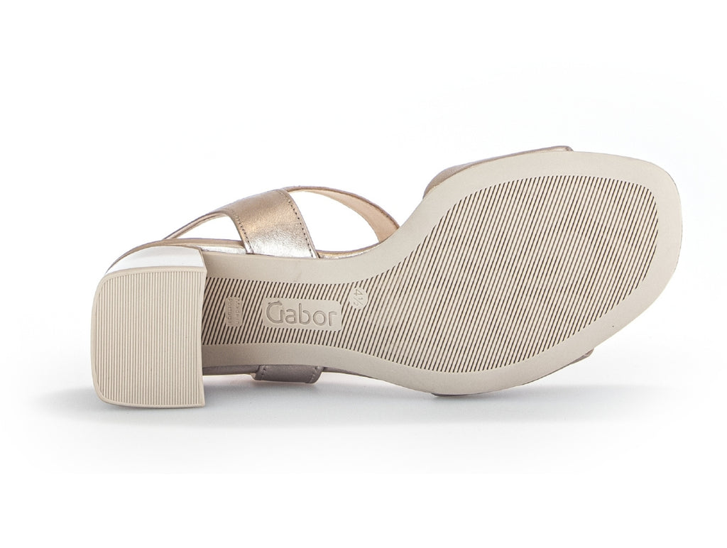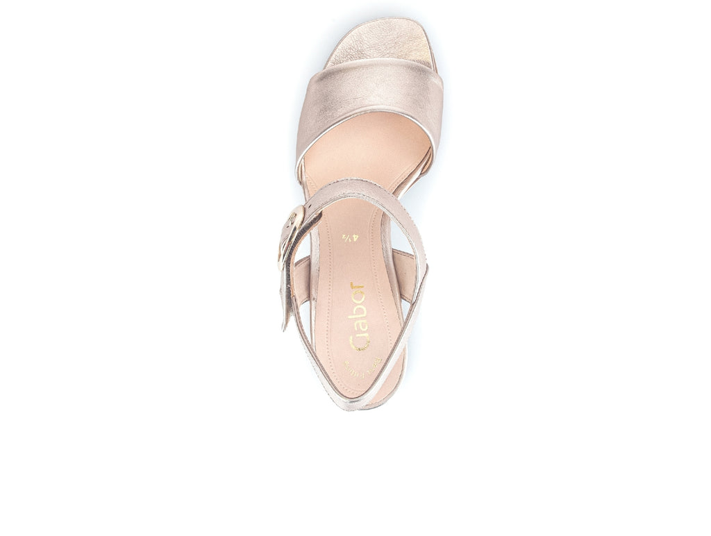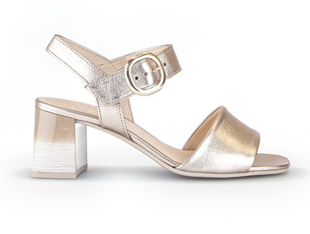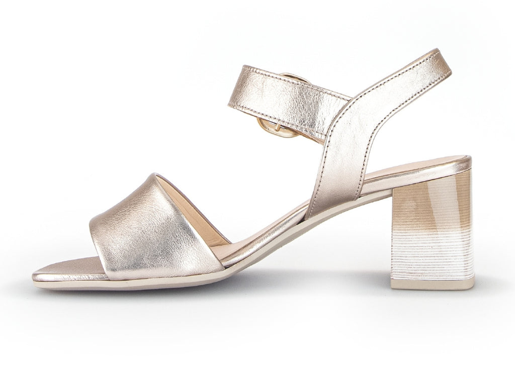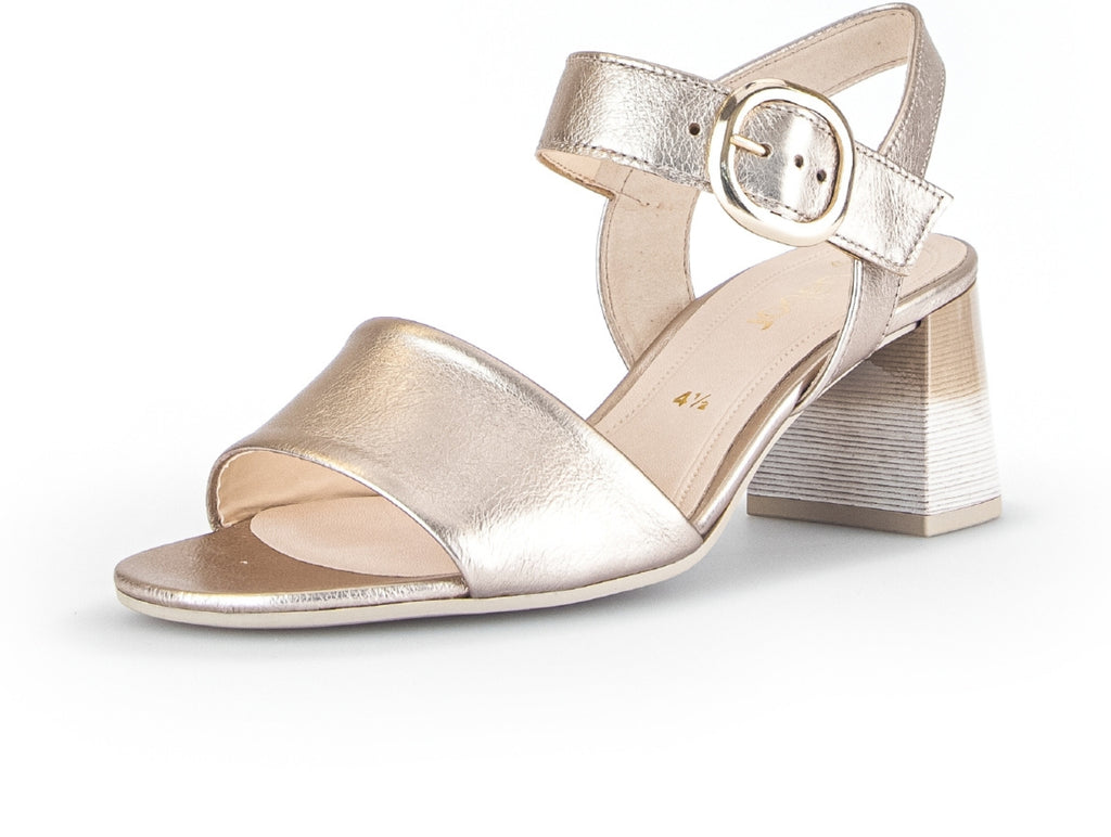 Sophisticated Summer style - Gabor 61.700.62 Kuger in shimmering gold. This elegant open-toe sandal features a 6.5cm block heel, a secure Velcro strap with chic buckle detail, and is part of the