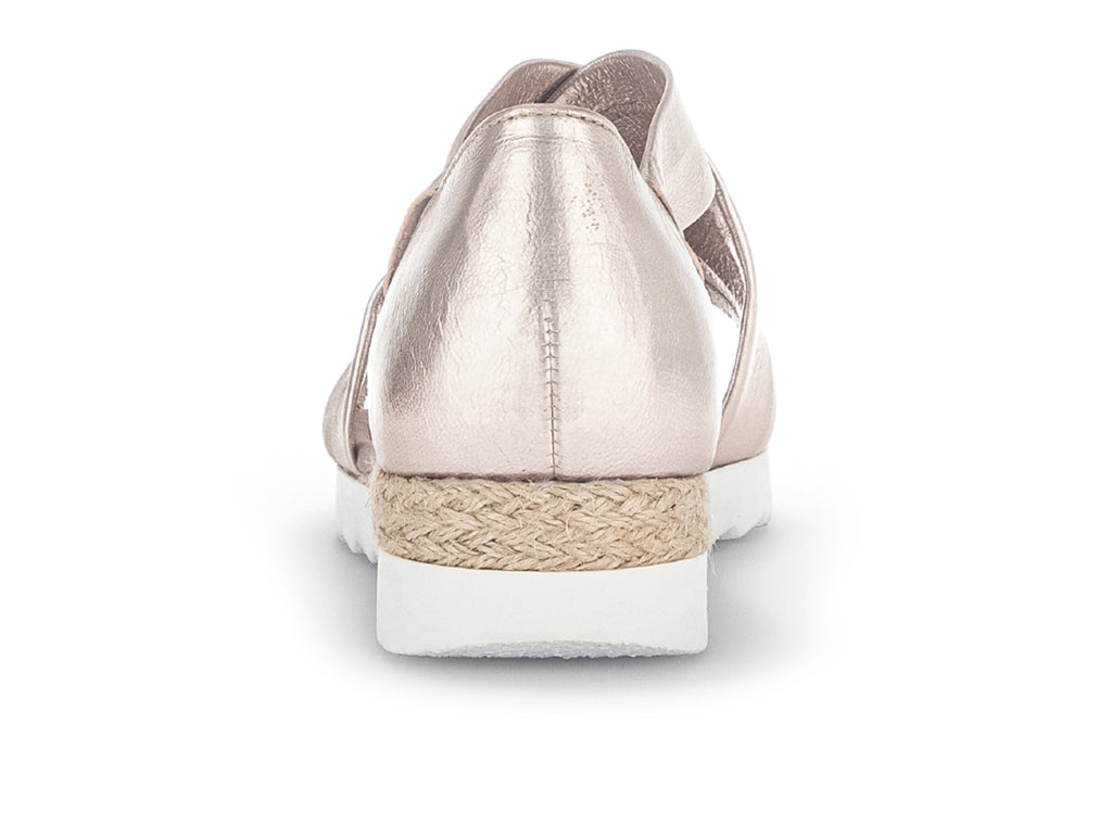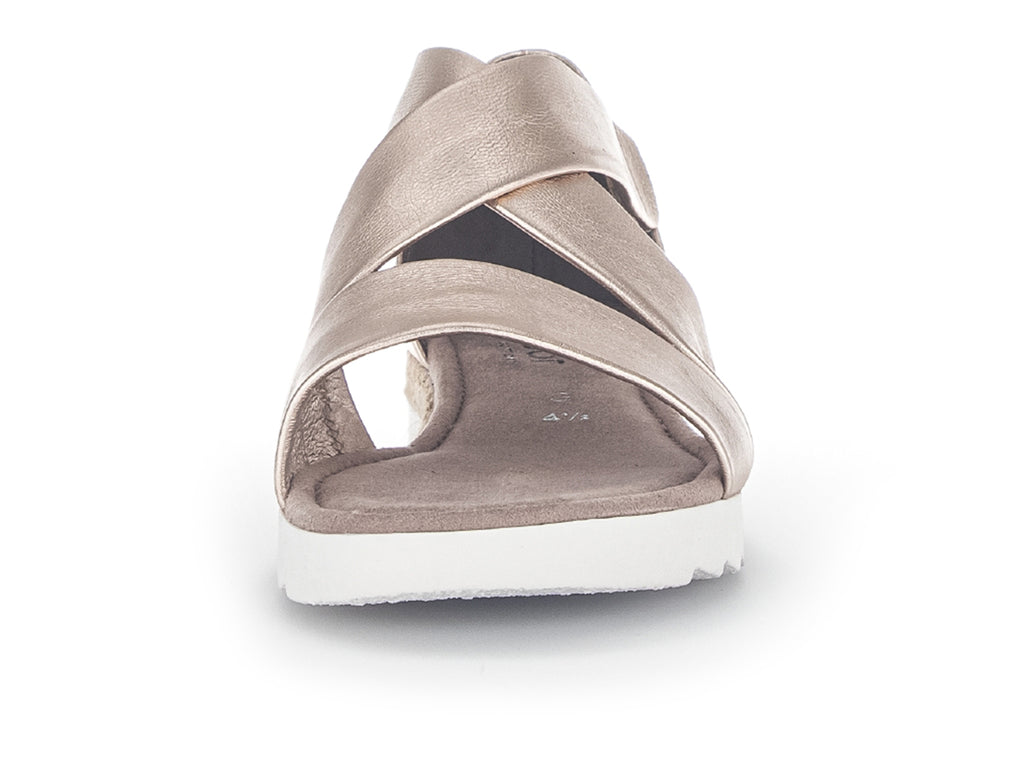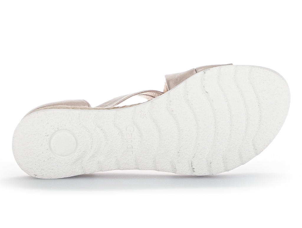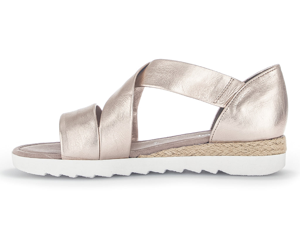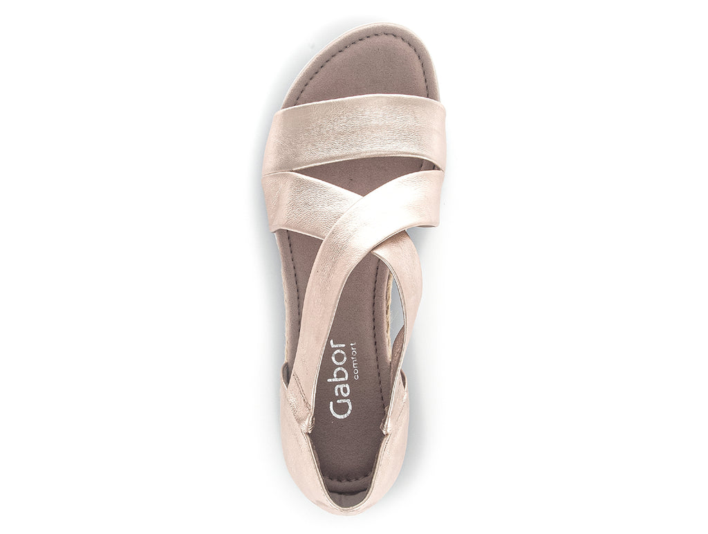 Beautiful Gabor 22.011.89 in muschel metallic sandals with criss-cross straps for a secure fit. These sandals feature a smooth leather upper with discrete elasticated gussets providing extra comfort. A slip-on style, these sandals offer an easy on off. The 2cm wedge heels woven panel contrasts beautifully against the white sole. Cushioned insoles keep feet comfortable while on the go. At Gabor Shoes Ireland we think these sandals would look great with a casual maxi dress.