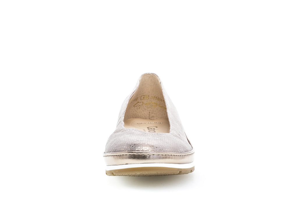 The Gabor 22.400.22 ooze comfort and style. They feature a cushioned leather insole with arch support as well as an elasticated rim to the front which will move with you while you walk. The stunning bronze edging and polka dot upper adds a touch of fun. The wide G width fitting provide a roomier fit while the patterned sole gives extra traction. At Gabor Shoes Ireland we think these shoes would look great paired with a beige trousers and a tailored denim shirt for a relaxed look.