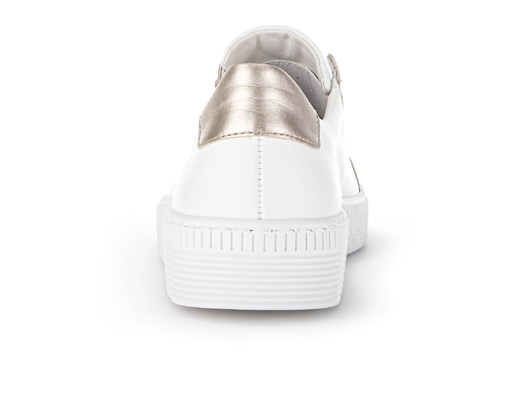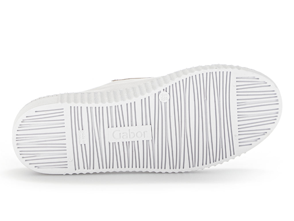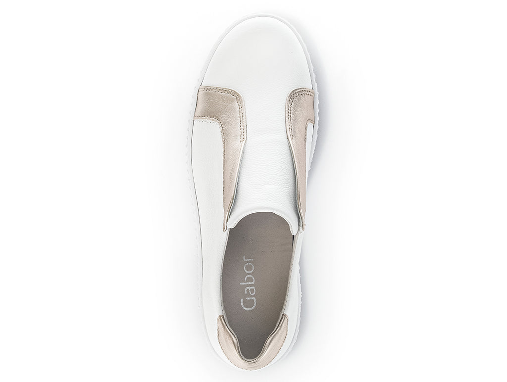 These Gabor 23.335.23 shoes are a gorgeous easy to wear shoe. The white leather upper features two subtle metallic gold panels along with a panel at the heel. As part of the Best Fitting range and a wider tread surface these shoes allow for more scope for your instep and the ball of your foot. With removable insoles these shoes are great if you require custom inserts. As a slip-on style this shoe allows for an easy on off along elastic panels for support. Here at Gabor Shoes Ireland, we think these are extremely versatile and could be worn with many outfit options for a casual daytime look.