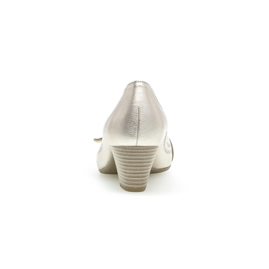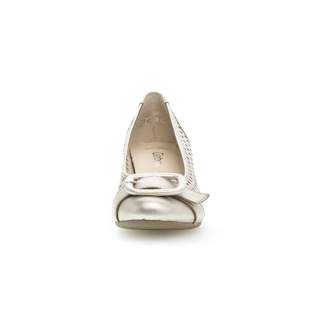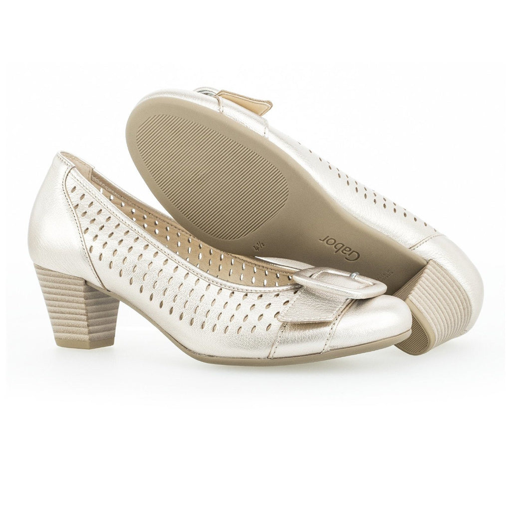 The stylish Gabor 25.484.63 shoes in pewter are ideal for the office or for an occasion. The perforated detail on the sides of the shoes gives them an edgy feel while the 5cm heel adds wearable height. The buckle detail on the toe of the shoe adds a unique, feminine edge. The slip-on design adds ease of wear. At Gabor Shoes Ireland we think the Gabor 25.484.63 shoes in gold would be great paired with a knee length dress or skirt for a stylish special occasion look.