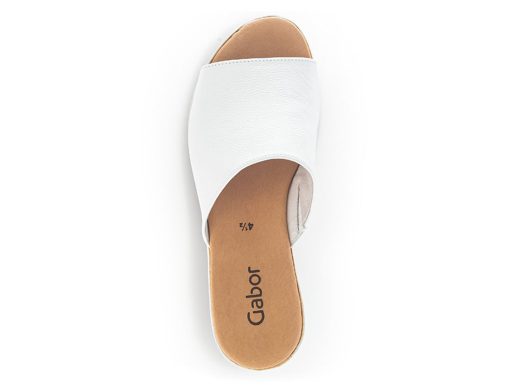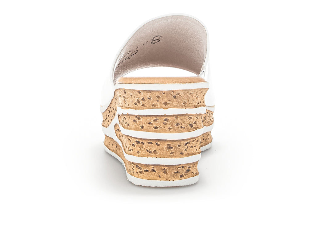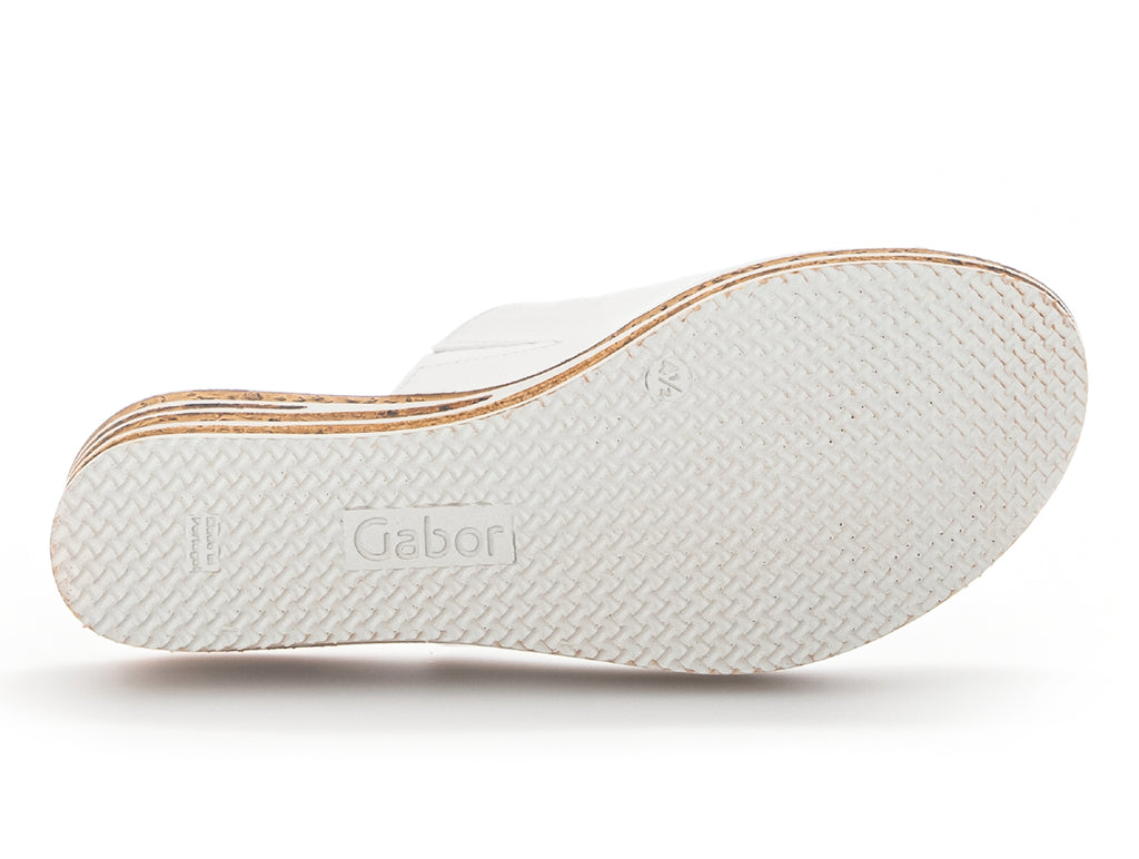 Gabor 24.651.21 White sandals are a wardrobe staple. The upper features a wide front strap across the instep and comfort comes in the form of a padded insole. As a slip on style it allows for an easy on off. The cork effect wedge sole with a twirl pattern running through adds 6.5 cm of height. At Gabor Shoes Ireland we think the Gabor 84.651.21 White sandals would be a maxi dress.