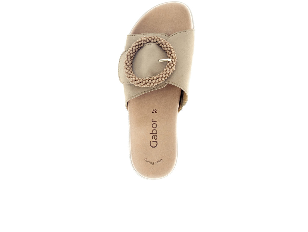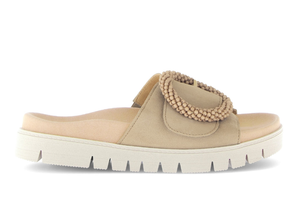 The Gabor 63.745.14 Everly in caramel combines effortless style with superior comfort, making it a must-have for your summer wardrobe. Designed as a chic slip-on sandal, it features an open toe and a Velcro fastening with a large decorative buckle for a secure and adjustable fit.