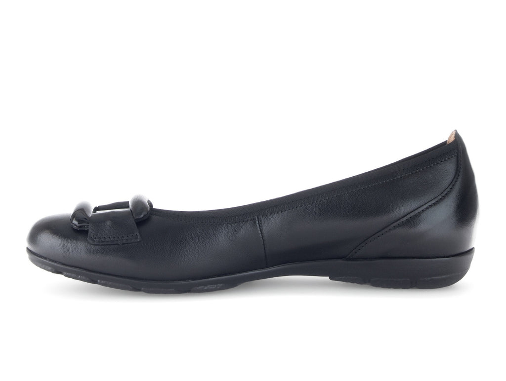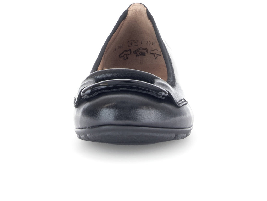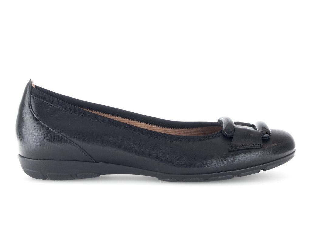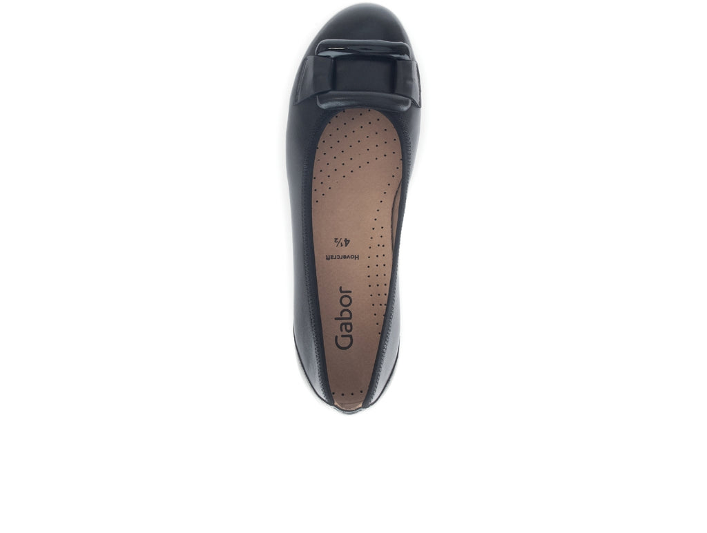 The Gabor 54.166.27 Raven is a black ballerina style shoe with a slip-on design. It features an original HOVERCRAFT chamber sole, with integrated air chambers that cushion every step and promote natural rolling of the foot. The ergonomic design and shock-absorbing effect provide joint protection, making it an ideal shoe for long periods of wear. A standard width fit in a low 2.5cm heel height, it offers both comfort and style. Call in to Walsh Brothers Shoes, Tralee or buy online.