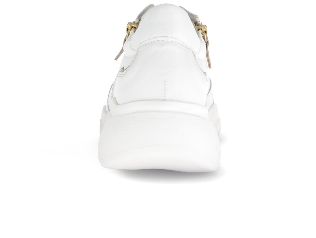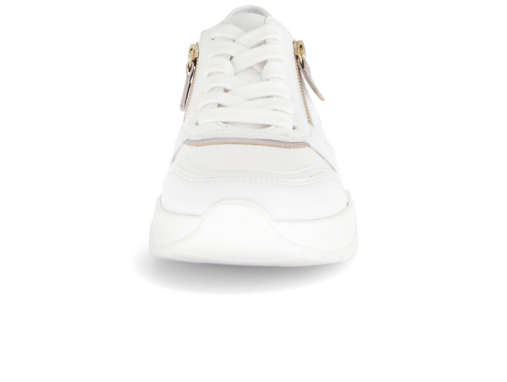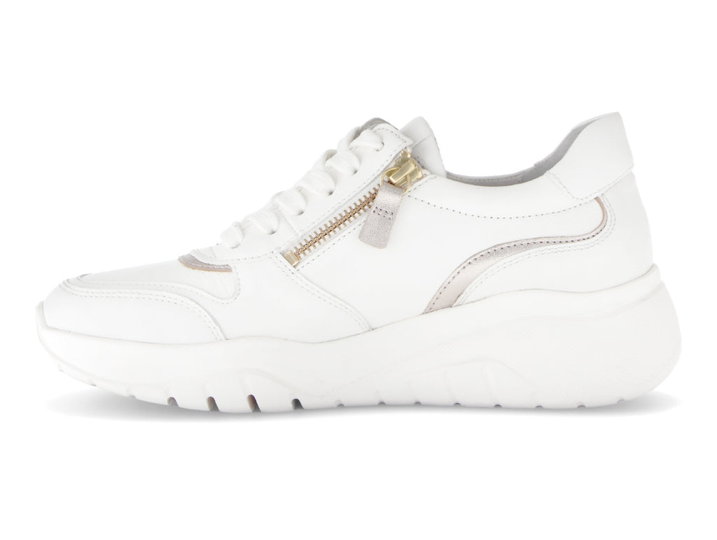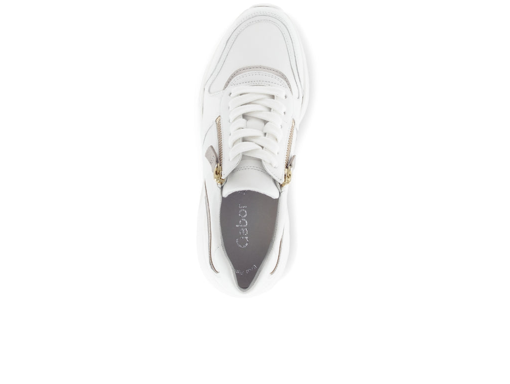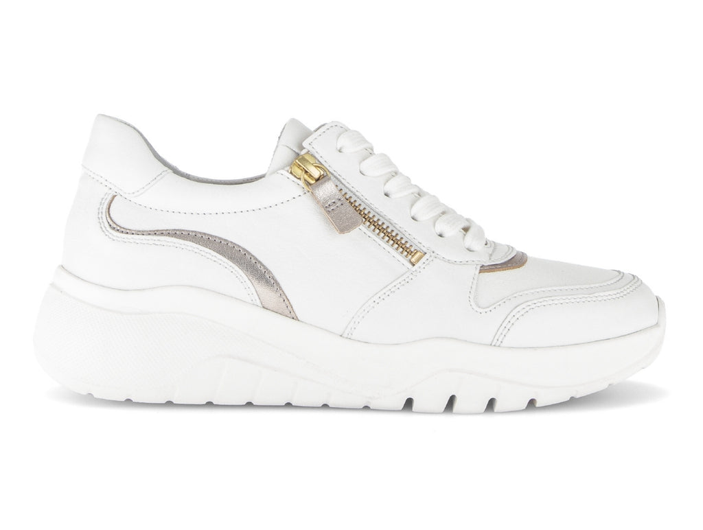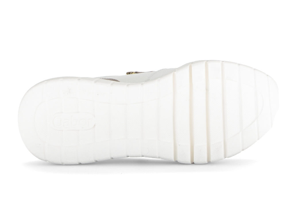 The Gabor 53.450.20 Whitaker Light Cream trainer is a modern and stylish choice. With its laced design and outer zip, this shoe offers convenience and easy wearability. The removable insoles provide added comfort, while Gabor's Best Fitting Range allows for a wider tread area and superior comfort. Complete with a 5cm wedge heel and standard F width fit, this trainer is the perfect choice for both fashion and functionality.